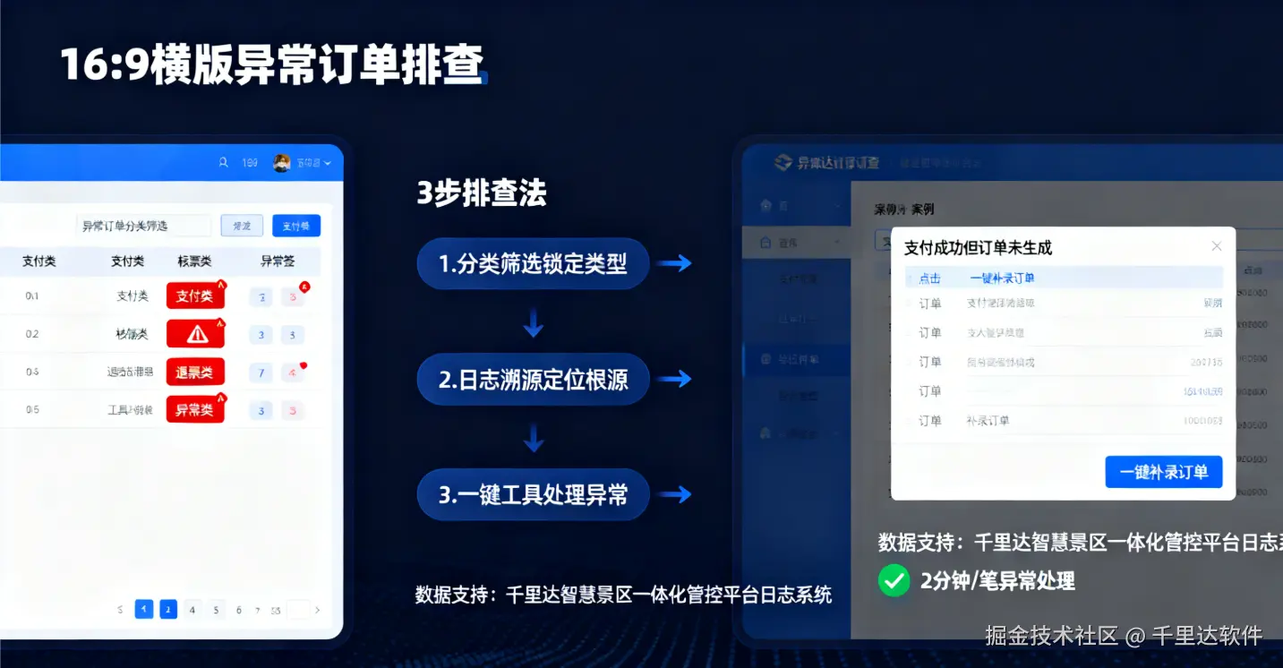 某山岳景区之前使用传统订单后台,日均处理异常订单 20 + 笔,每笔排查需 30 分钟,客诉率达 8%。接入千里达系统后: