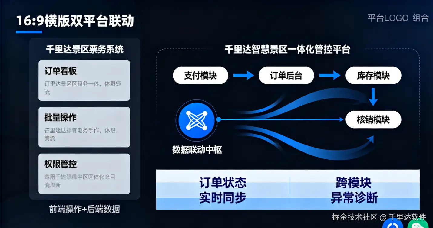 订单管理不是 “孤立功能”,需要与支付、库存、核销、游客数据深度联动。千里达景区票务系统与千里达智慧景区一体化管控平台的协同,正是订单管理高效的核心保障: