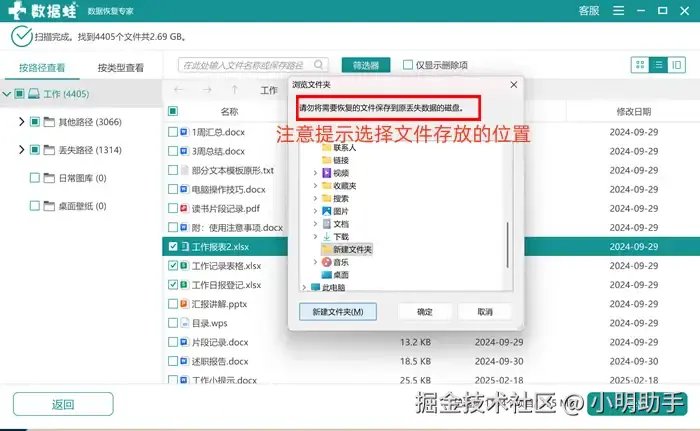 步骤3: 最后还需要在“浏览文件夹”中选择自己的恢复文件之后存放的位置,确定后点击按钮。