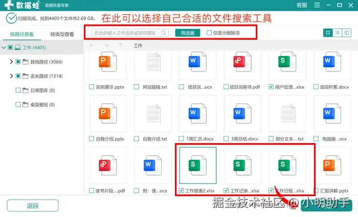 提示:数据 蛙还附有多种文件搜索工具,我们可以选择“筛选器”、“搜索框”,在里面设定目标文件相关的信息,可以快速精准定位。