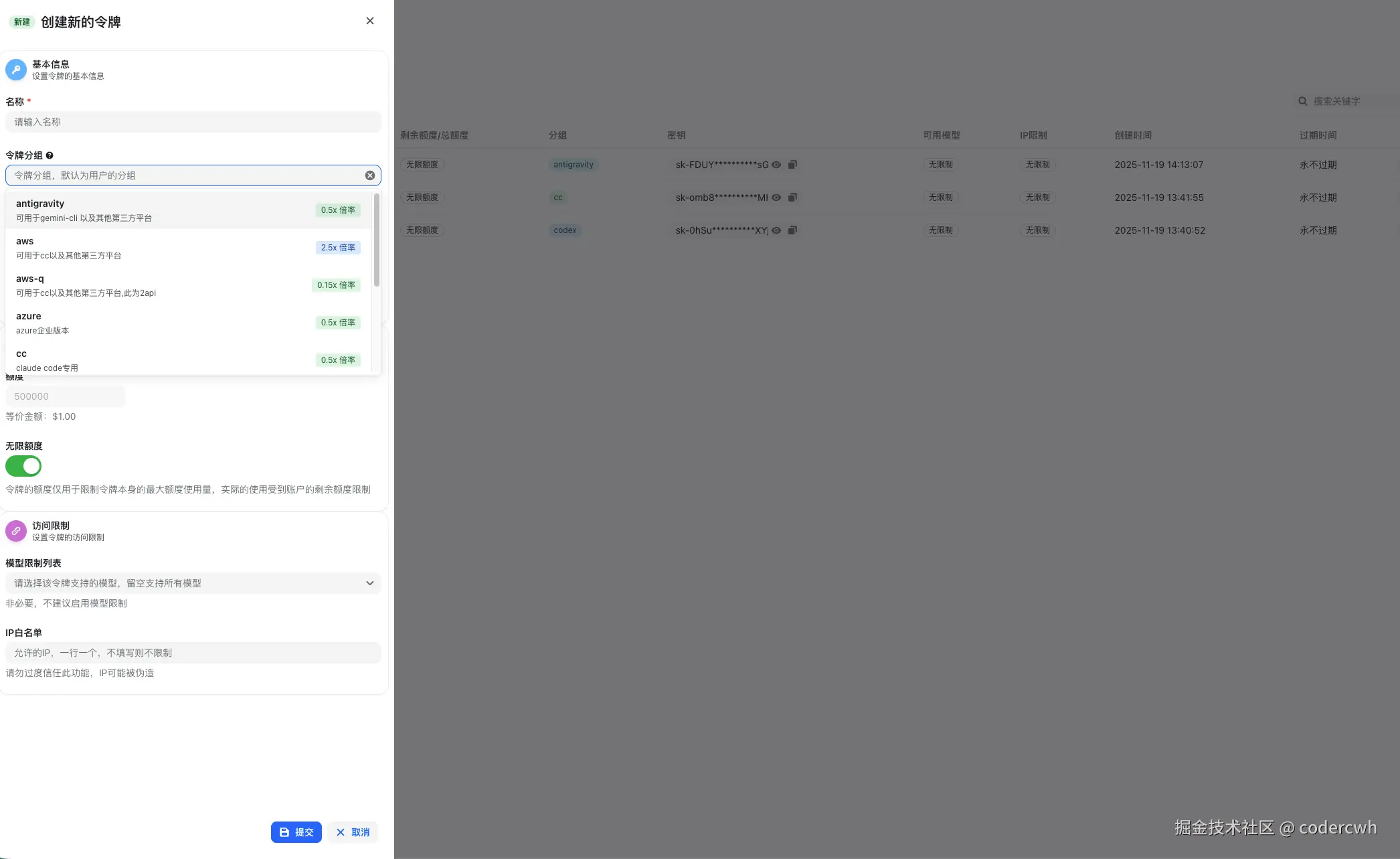打开这个网站后,创建一个个人令牌,如下图,先选择aws-q分组(倍率越高,耗费越高)