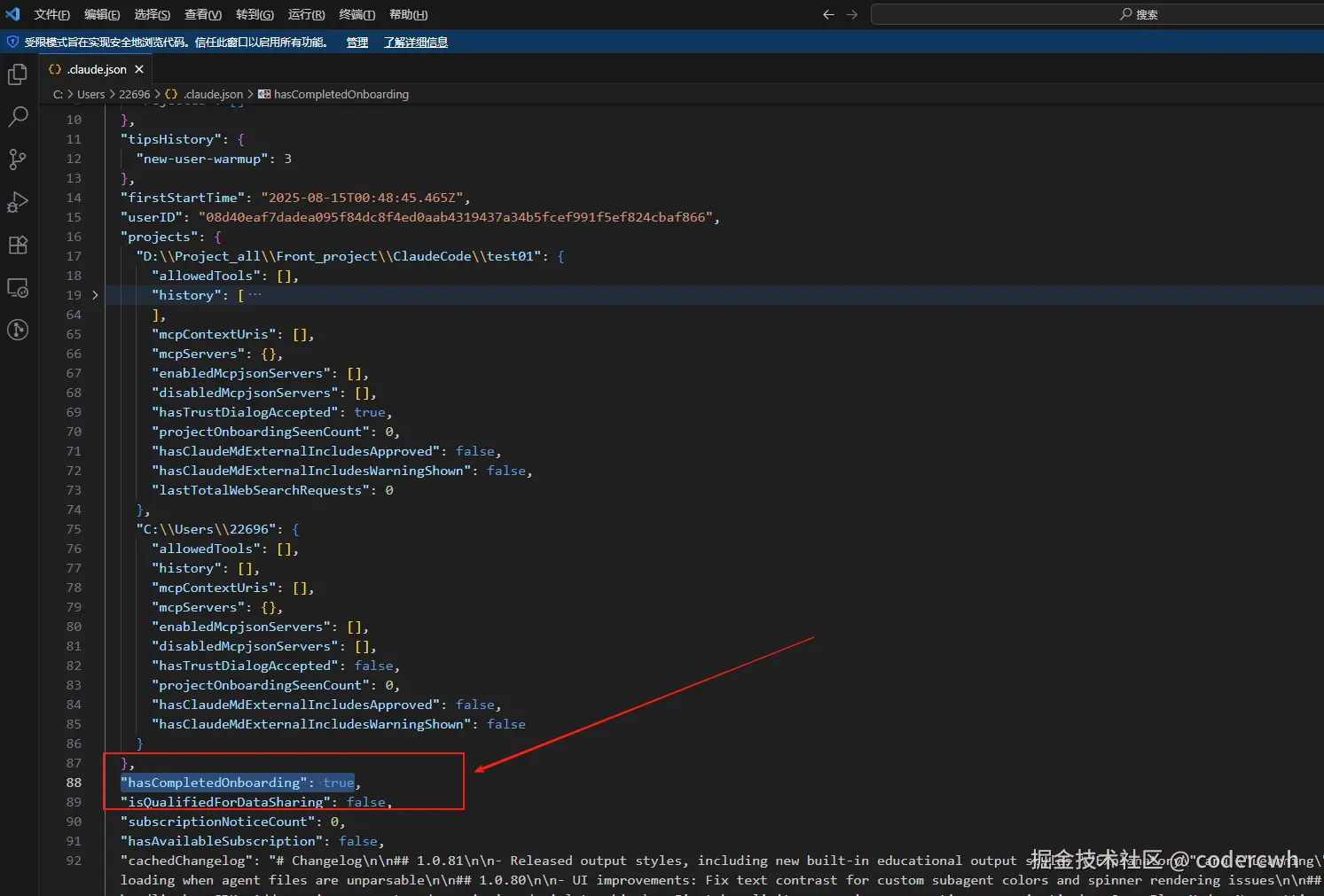 找到.claude.json文件,打开这个配置文件后新增一段配置,如下图: