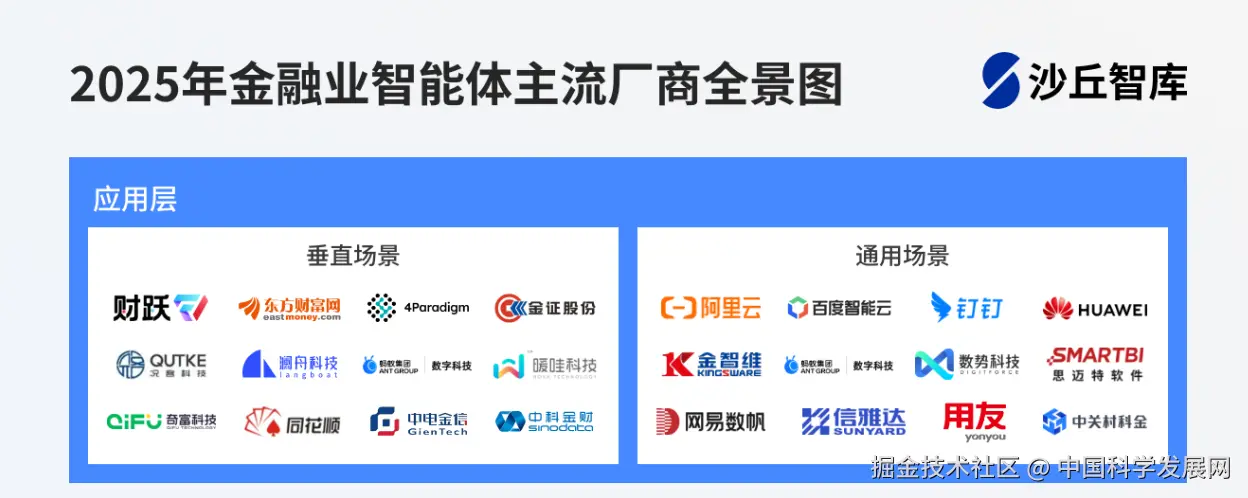 在此背景下,沙丘智库重磅发布《2025 年金融业智能体主流厂商市场指南》报告,通过对金融业智能体市场发展态势与竞争格局的深度剖析,结合多家厂商调研及专家深访,从产品成熟度、行业落地深度、商业化进展等维度开展专业评价,筛选出各细分市场领先企业,绘制金融业智能体主流厂商全景图,为企业破解选型难题、把握行业趋势提供权威参考。