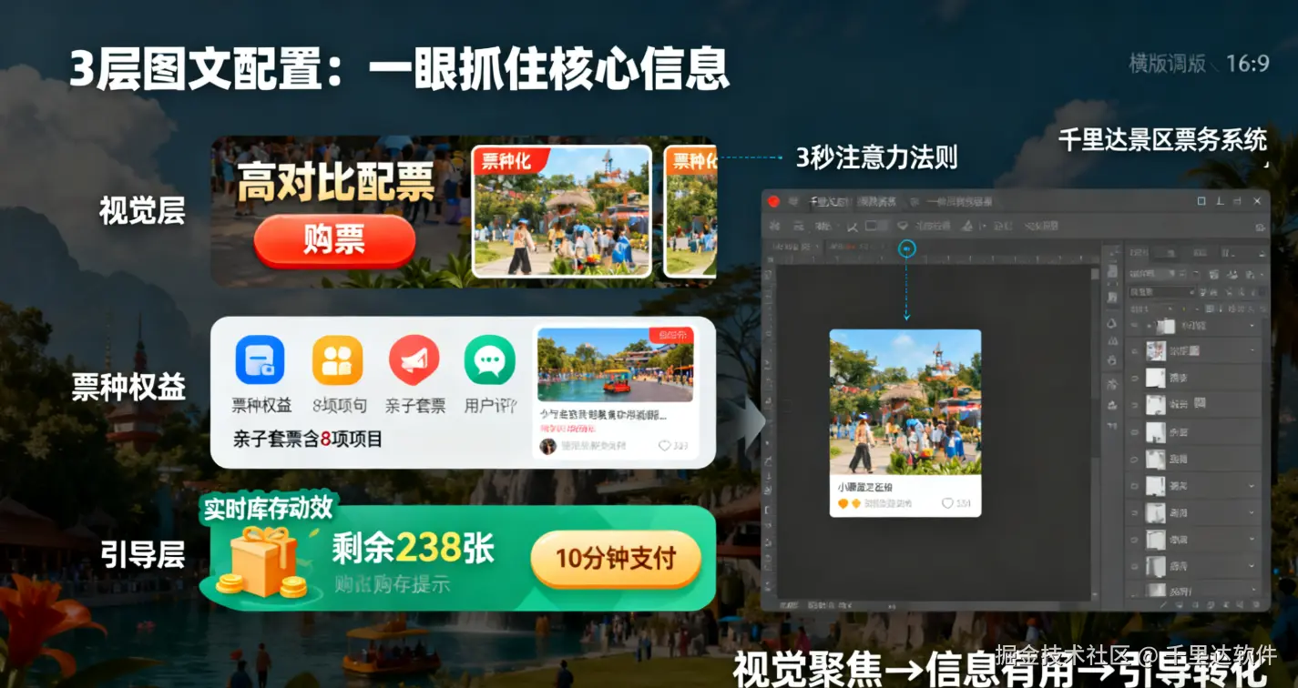 购票页面的图文不是 “越多越好”,而是要按 “优先级分层”,让游客快速获取关键信息: