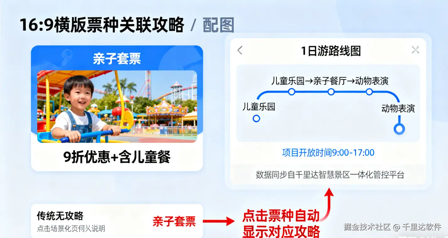 • 按时段嵌入:若游客选择 “夜场票”,页面自动显示 “夜场攻略”(配 “灯光秀时间 + 夜场专属项目图”,如 “20:00 水幕电影,夜场票含免费观看”),这些时段信息通过千里达景区票务系统的 “时段票管理功能” 同步,确保准确。