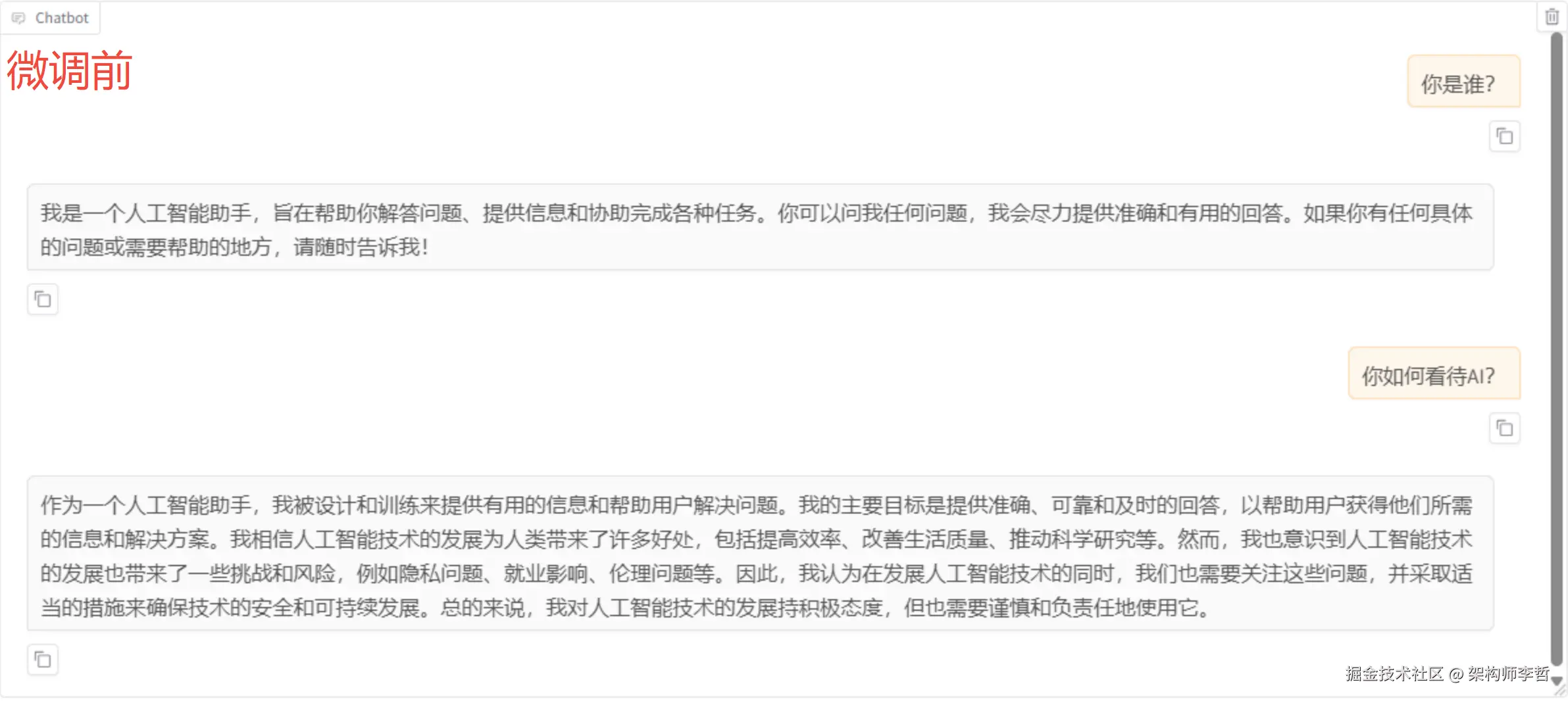 这是微调前大模型的回答。此时的模型如同一个精准的“知识库”,回答客观专业、逻辑清晰,能够可靠地完成信息处理任务。然而其语言风格统一,缺乏个性与情感,更像一位严谨但缺少性格的“标准助手”。