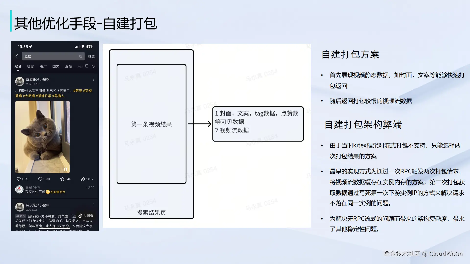 自建打包优化: 把搜索结果拆成两部分:一部分是能够快速获取的静态元数据,如视频封面、标题文案、点赞评论数等,另一部分则是获取相对耗时的动态视频流数据。核心思路是先返回静态元数据,让用户迅速看到结果的框架,再加载视频流以供播放。然而,在缺少原生 RPC 流式支持的背景下,搜索服务端架构团队不得不采用一种变通方案:通过一次 RPC 调用触发两次独立的打包操作,并将动态视频流数据临时缓存在服务实例的内存中。第二次打包时,通过硬编码的 IP 地址去获取缓存数据。这种设计虽然在当时解决了问题,但无疑增加了架构的复杂性,并引入了潜在的稳定性风险------该方案强依赖服务实例的内存缓存,在实例发生重启或漂移时,存在数据丢失和获取失败的风险。