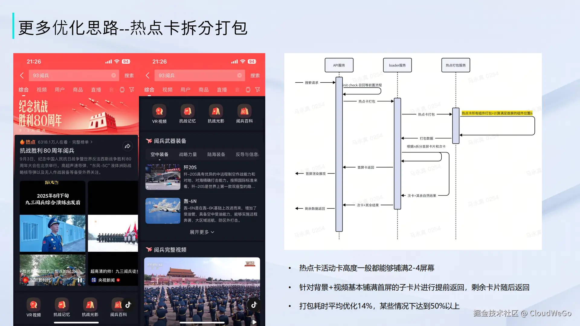 在完成基础链路的流式改造后,搜索服务端架构团队还针对一些特殊业务场景进行了深度优化。例如,在"抗战胜利80周年阅兵"这类重大活动期间,用户搜索相关关键词时,返回的单条结果卡片可能铺满四倍于常规的屏幕高度。在这种情况下,仅仅打包首屏所需的一两个常规组件是远远不够的。
