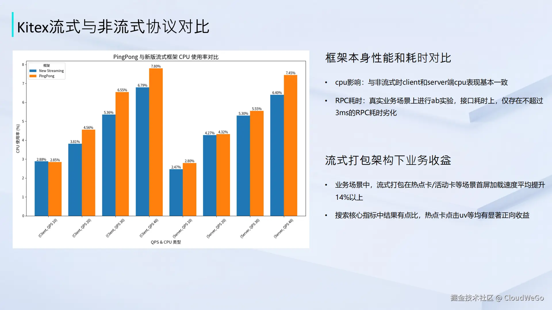 CPU 占用: 无论是客户端还是服务端,流式协议带来的额外 CPU 消耗与非流式场景基本持平,并未引入新的性能负担。