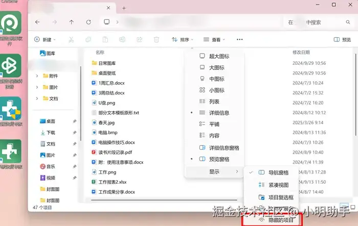 步骤2: 在上面点击“查看”,然后指向“显示”,最后点击“隐藏的项目”。