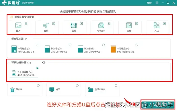 步骤1: 通过软件的首页选择好需要扫描的数据类型和扫描U盘,完成选择后点击“扫描”,操作软件进入下一步;