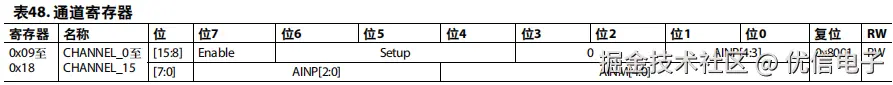 CHANNEL通道寄存器(0x09~0x18):置通道(AINP输入和AINM输入),使能或禁用通道,以及选择设置。设置可从用户定义的8种不同选项中选择。当ADC转换时,它会自动遍历所有使能的通道。如果需要,用户可以在一个序列中对某些通道多次采样。此位,用户还可以将诊断功能包括在序列之中。
