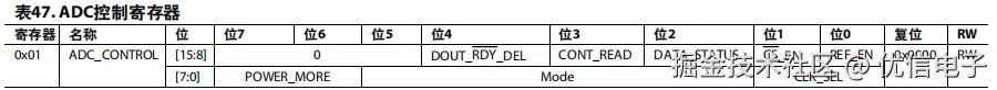 ADC_CONTROL寄存器(0x01):用于设置 ADC 的工作模式(如连续采样)、功耗模式、参考电压源、时钟源等。其中,DATA_STATUS为状态寄存器内容传输的使能位。可以将状态寄存器的内容附加到AD7124-8的每次转换结果。使能多个通道时,此功能很有用,因为状态寄存器可确定哪一通道与数据寄存器值对应。每次输出转换结果时,都会附加状态寄存器的内容。DATA_STATUS置1后,状态寄存器的内容将与每次从数据寄存器读取的数据一同传输。