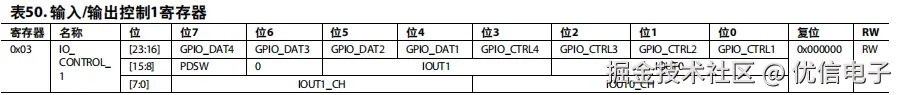 IO_CONTROL_1寄存器(0x03):用于控制 I/O 引脚(如 PSW 开关、REF 缓冲区、烧断电流检测等)。