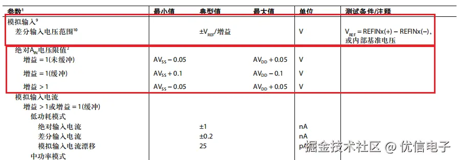 根据数据手册描述,模拟输入信号范围是由基准电压源和增益决定。如2.5V内部基准电压源,设置增益为1,则差分输入信号范围为±2.5V。其中,又因为AINx输入范围要在[AVSS,AVDD]之间,板子是单电源输入且看原理图,AVDD接了3.3V,AVSS接了GND,即[AVSS,AVDD]=[0,3.3V],即AINx输入信号要输入正信号。