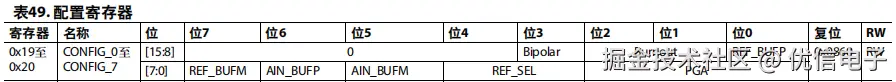 CONFIG配置寄存器(0x19~0x20):设置该通道对应的:增益、基准源、输入缓冲等。