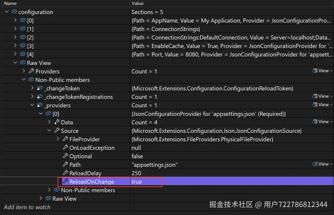 要想找到答案,可以深挖 Microsoft.Extensions.Configuration.ConfigurationRoot 类,即代码 BuildConfiguration(); 的返回类型,为了方便可视化观察,我用 vs 直接找下给大家看看,截图如下: