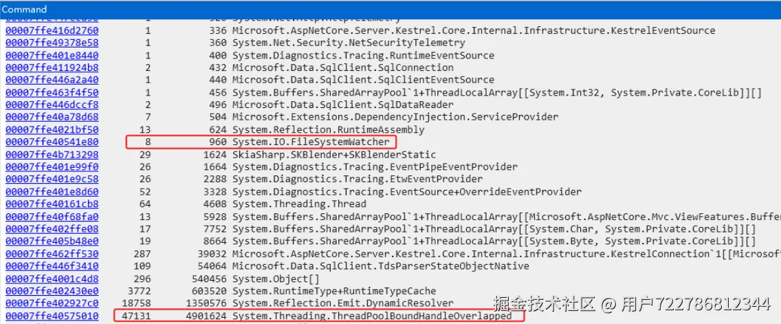 为了找出原因,上 windbg 附加,使用 !dumpheap -stat 观察托管堆,截图如下: