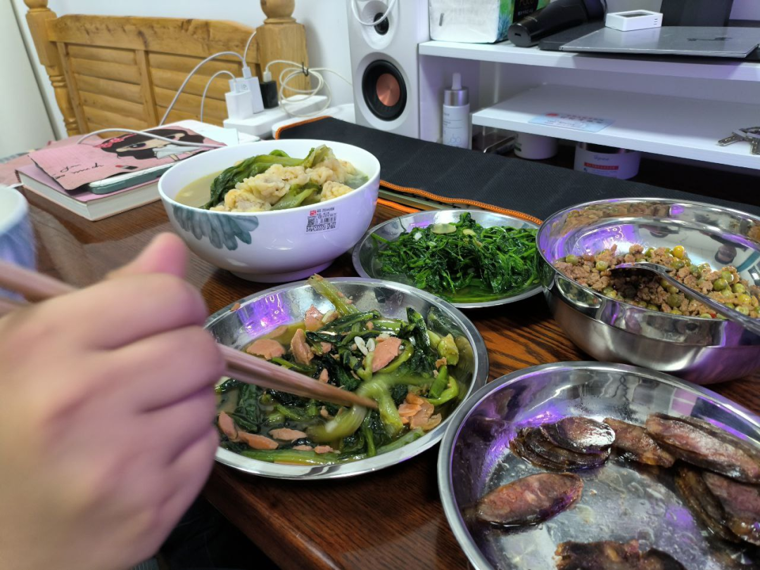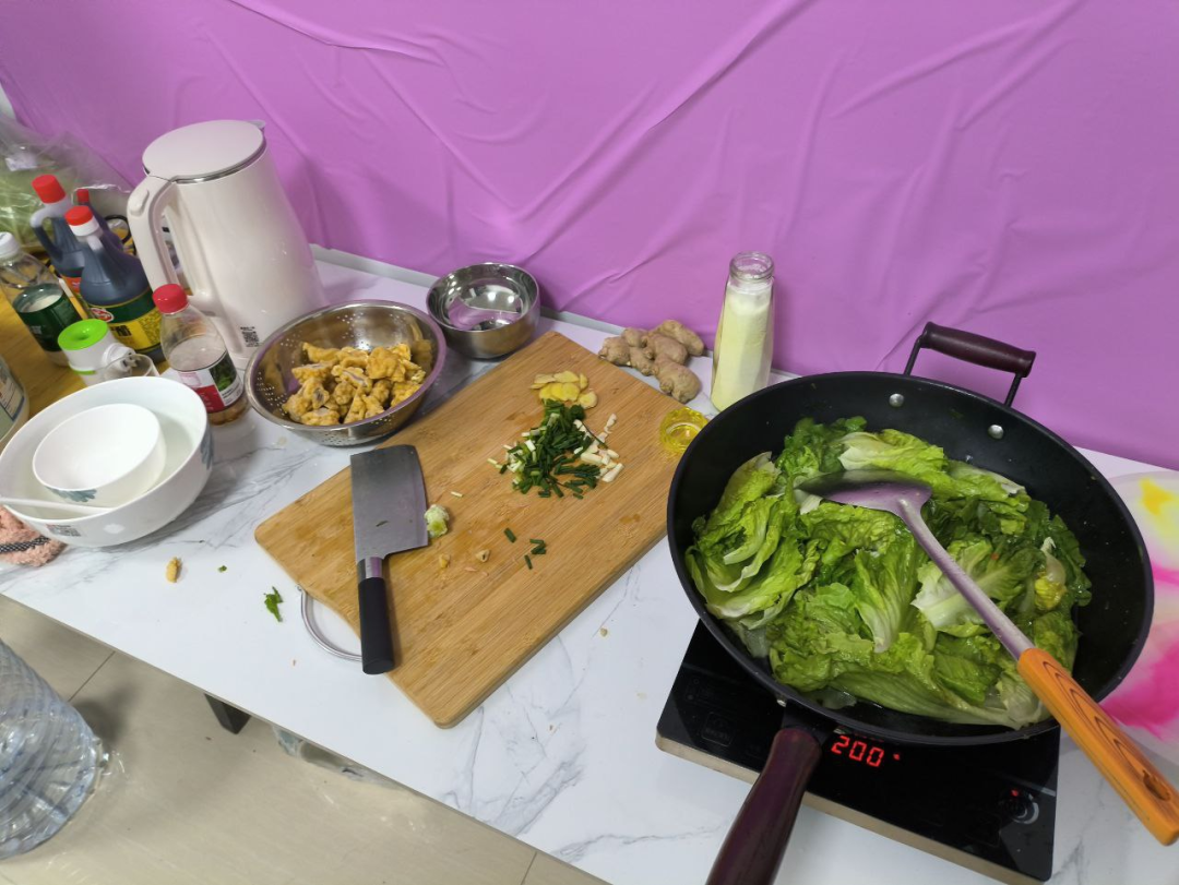 生菜酥肉汤最后做,烧水太慢了,我们就先吃。起锅的时候我总感觉差点盐,他跟我说别加了别加了,淡点好,中和一下。