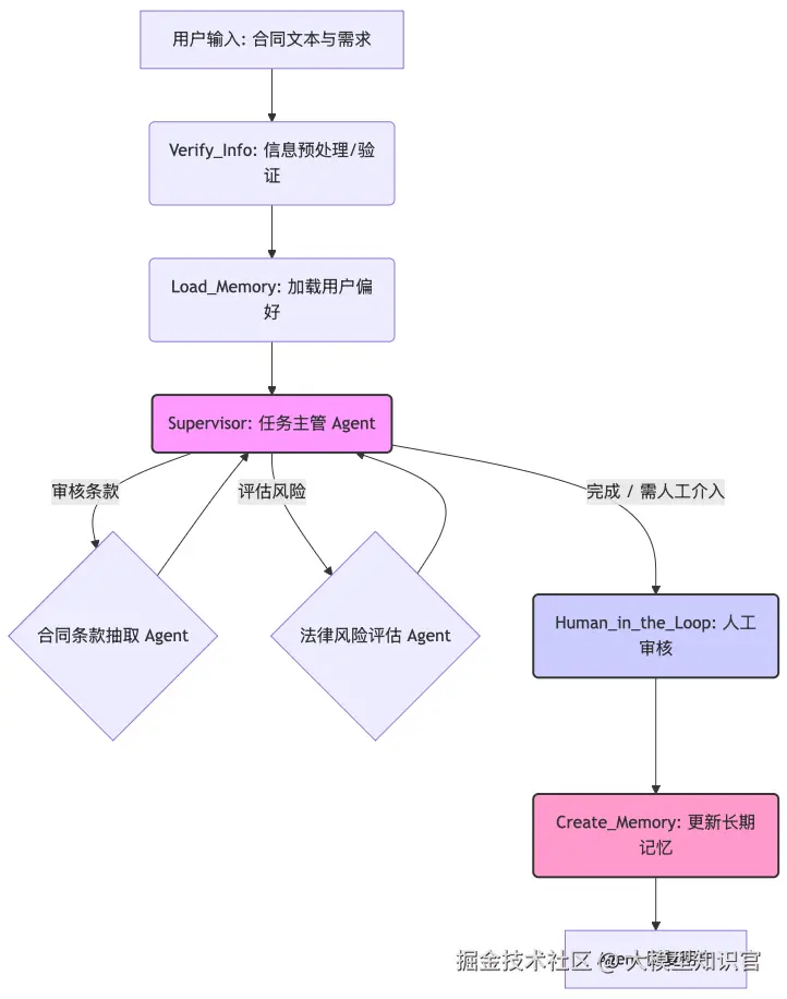 本文将深入探讨如何利用 LangGraph实现一个完备的**“智能合同审核与风险分析系统”。我们将采用 Supervisor(主管) 架构,并详细讲解 LangGraph 中的状态管理、工具定义、短期/长期记忆,以及人机协作(Human-in-the-Loop, HITL)**功能。