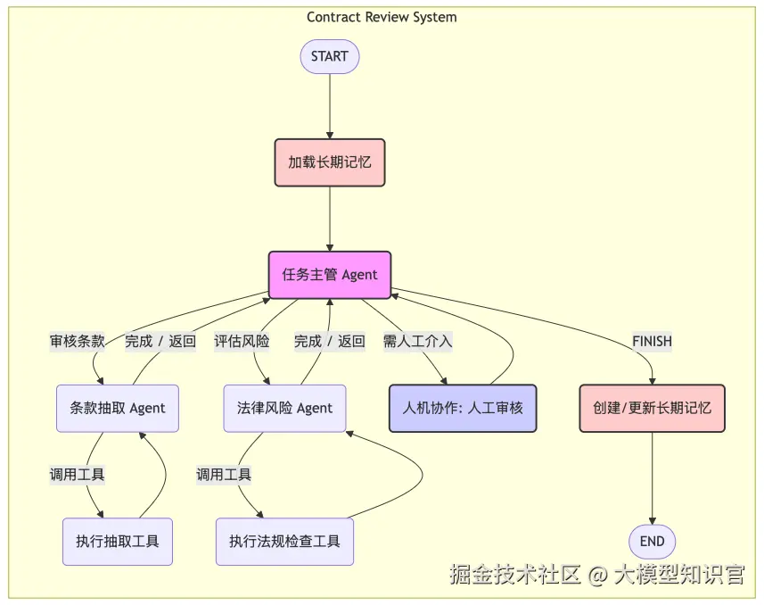 # 构建主图builder = StateGraph(ContractState)# 1. 添加业务逻辑节点builder.add_node("load_memory", load_memory) builder.add_node("create_memory", create_memory) builder.add_node("human_in_the_loop", human_in_the_loop_node) builder.add_node("supervisor", supervisor_agent)# 2. 添加子 Agent 及其工具执行节点 # 抽取 Agent builder.add_node("extraction_agent", extraction_agent) builder.add_edge("extraction_agent", "extraction_tool_node", check_for_tool_call) builder.add_node("extraction_tool_node", extraction_tool_node) builder.add_edge("extraction_tool_node", "extraction_agent")# 风险 Agentbuilder.add_node("risk_agent", risk_agent) builder.add_edge("risk_agent", "risk_tool_node", check_for_tool_call) builder.add_node("risk_tool_node", risk_tool_node) builder.add_edge("risk_tool_node", "risk_agent")# 3. 设置流程起点和核心路由 # 起点 builder.set_entry_point("load_memory")# 记忆加载 -> 主管builder.add_edge("load_memory", "supervisor")# 主管 -> 路由 (决定下一个 Agent, 人工介入, 或结束流程)builder.add_conditional_edges( "supervisor", route_supervisor, { "extraction_agent": "extraction_agent", "risk_agent": "risk_agent", "human_in_the_loop": "human_in_the_loop", "create_memory": "create_memory", } )# 子 Agent/工具执行完成 -> 返回给主管builder.add_edge("extraction_agent", "supervisor") # LLM 回答完成,返回主管 builder.add_edge("risk_agent", "supervisor") # LLM 回答完成,返回主管 builder.add_edge("extraction_tool_node", "extraction_agent") builder.add_edge("risk_tool_node", "risk_agent")# 人工介入完成 -> 返回给主管重新处理人工指令builder.add_edge("human_in_the_loop", "supervisor")# 记忆保存 -> 结束builder.add_edge("create_memory", END)# 编译最终的 Agent 图contract_review_app = builder.compile(checkpointer=checkpointer)