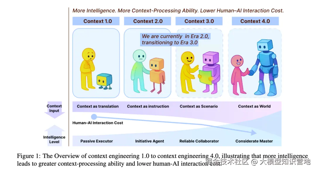 论文将上下文工程划分为四个标志性的时代,每个时代都与机器的智能水平紧密相连: