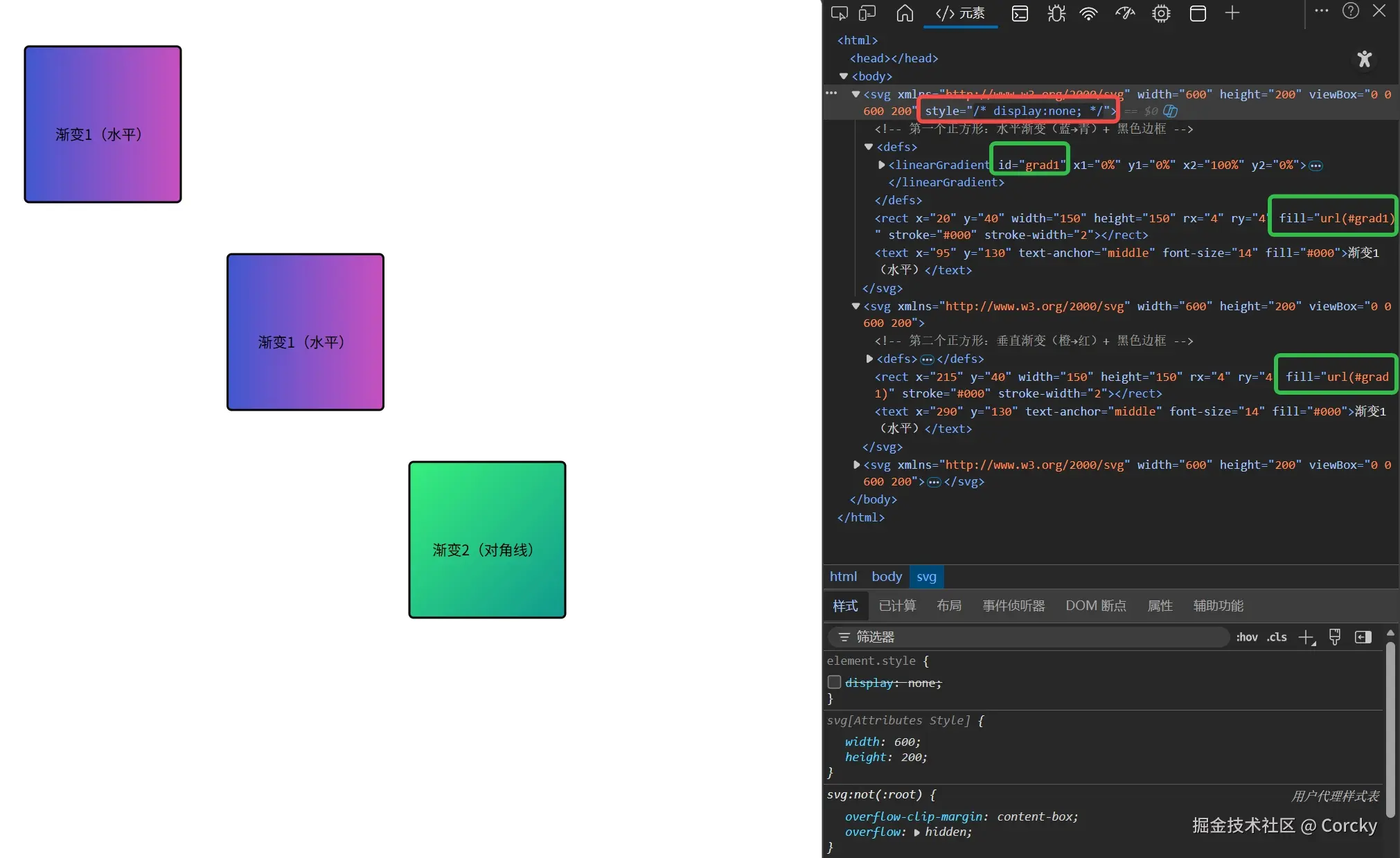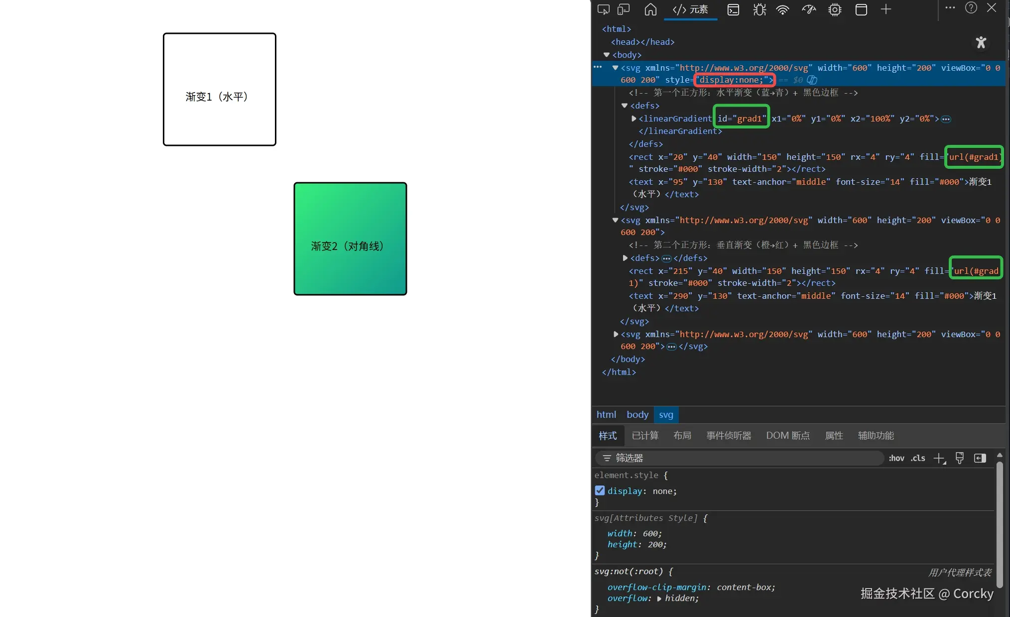 SVG 结构:两个实例内部 中的渐变 ID 完全一致(如 grad1)。
