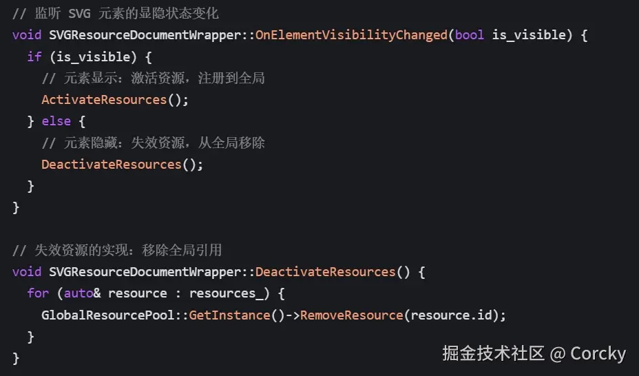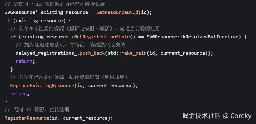 Chromium 内核 SVGResourceDocumentWrapper.cpp 中,明确实现了「注册阻塞」和「生命周期绑定」逻辑:未激活的同 ID 资源会阻塞新资源注册,元素隐藏时资源从全局池移除。