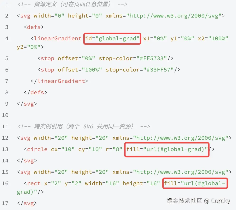 引用语法:通过 url(#资源ID) 引用资源,支持跨 SVG 实例引用(只要 ID 全局唯一),例如: