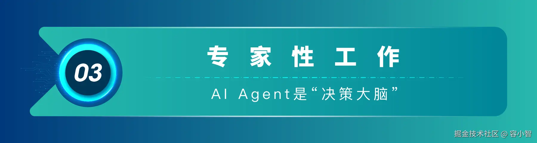 当企业需要制定投资策略、诊断复杂故障、定制服务方案等高度依赖专业知识、深度分析与创新思维的专家性工作时,AI Agent才是“破局关键”。它能像行业专家一样灵活应对复杂多变的情况,自主规划决策,成为市场总监、管理经理等岗位的“智能智囊”。