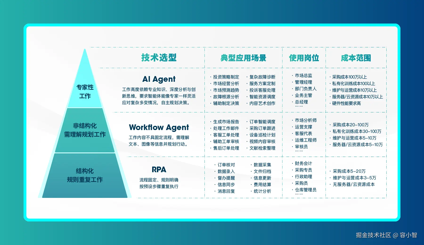 在企业数智化转型的浪潮中,“AI工具选型”成了许多管理者的心头难题:盲目上智能体,发现大量结构化工作用不上其能力,成本居高不下;只上RPA,又无法应对复杂的非结构化场景……容智信息基于千余家企业服务经验,总结出“三阶段AI生产力模型”,清晰界定RPA、Workflow Agent、AI Agent的适用边界,让企业每一分AI投入都精准转化为业务价值。