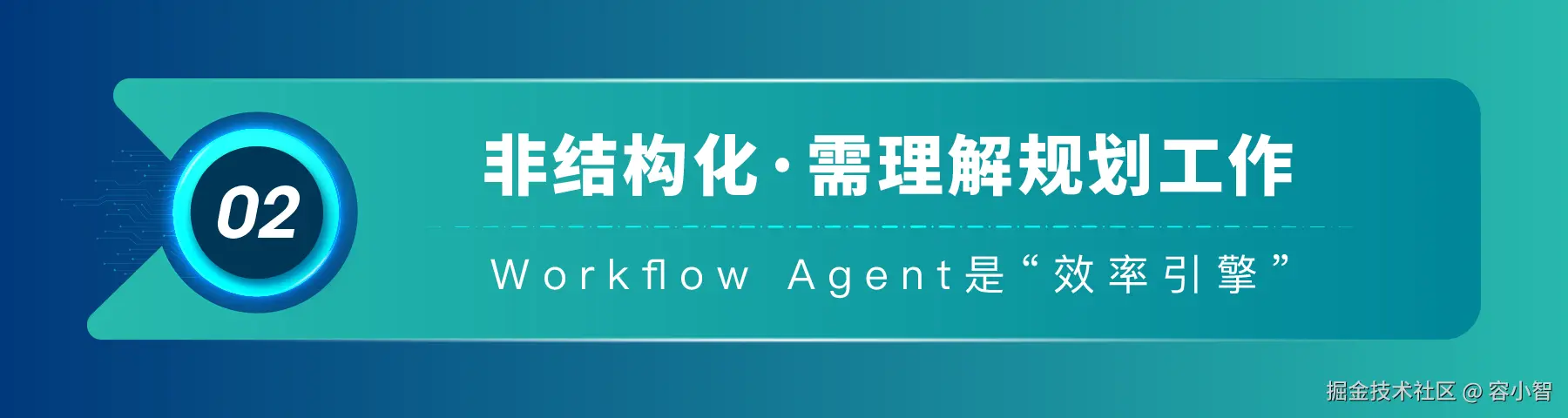 面对生成市场报告、处理工单邮件、辅助工单审核等无固定流程、需理解文本/图像的非结构化工作,Workflow Agent展现出独特价值。它能解析非结构化信息,规划行动路径,成为市场、运营、客服岗位的“智能助手”。