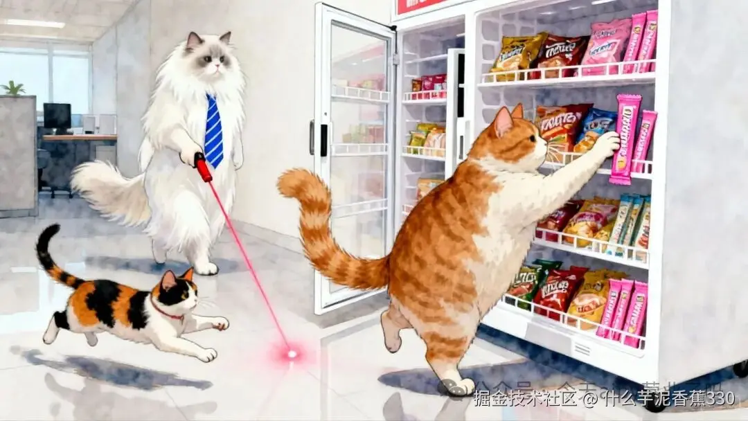 下午茶时间,阿橘发现零食柜里的猫条只剩最后一根,刚要伸手,隔壁部门的三花猫咪咪突然窜出来抢夺。两只猫围着柜子上演"爱的魔力转圈圈",最终被总监用激光笔引开:"再抢扣本月罐头配额!"阿橘委屈地舔爪子:"明明是我先看到的..."