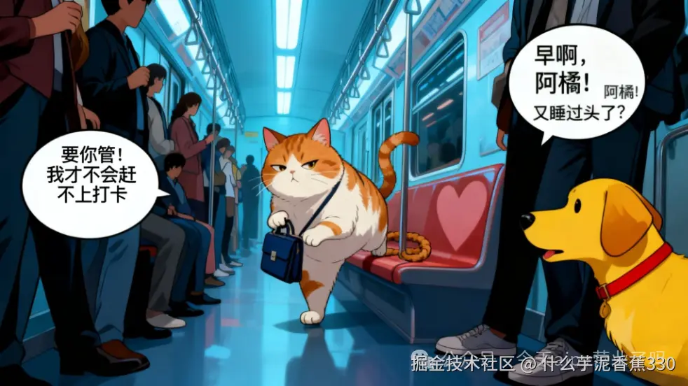 阿橘背着迷你公文包(里面装着猫薄荷和冻干),在人潮中灵活穿梭。地铁门一开,它"嗖"地窜到爱心专座,用尾巴圈住座位示意"此座已占"。邻座的柯基犬同事旺财凑过来:"听说今天老板要检查猫抓板PPT?"阿橘打了个哈欠:"早用爪子练过了,保证抓出完美曲线!"