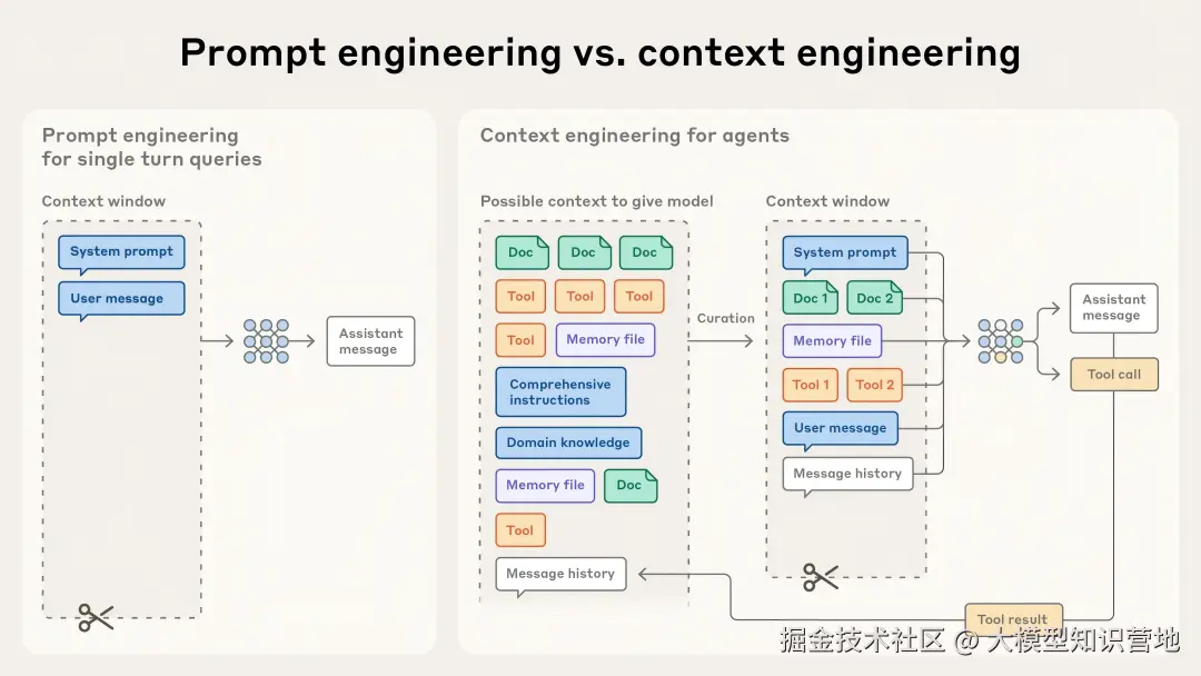 而上下文工程指的是,在模型推理时,怎样挑选和管理进入上下文的一整套信息,这些信息不仅来自提示本身,也包括各种可能以其他方式(比如工具调用)被放进上下文的内容。
