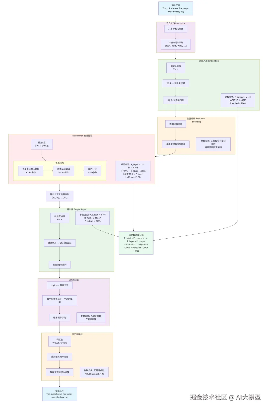 案例:GPT-3 175B 参数计算实例,参数:V = 50,257,H = 12,288 (GPT-3实际使用),L = 96。 计算过程:
