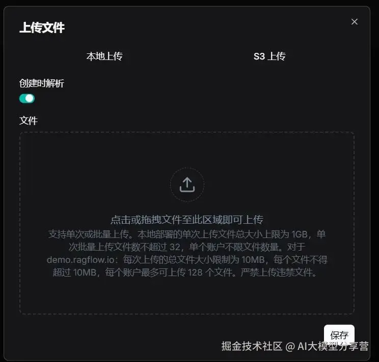 我喜欢把“创建时解析”打开,上传完文档就自动解析分块、弄关键词、给块提问题等。