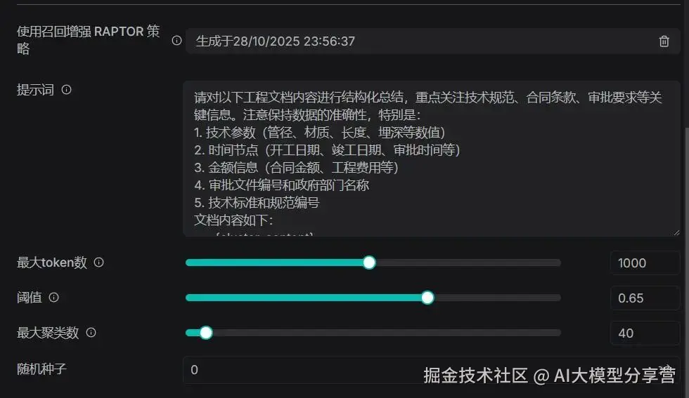 工程场景选择建议:① 正式项目知识库:固定种子值(如100)——确保团队成员检索时“知识树”结构一致,避免因聚类变化导致检索结果差异;② 测试/优化阶段:不固定(或多次调整种子值,如100、200、300)——对比不同聚类结构,选择最贴合工程逻辑的方案(如优先按“标段”还是“工序”聚类)。