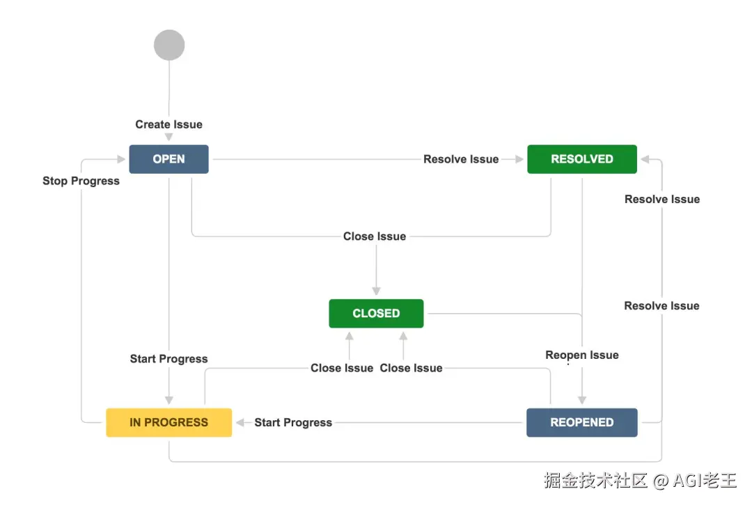 这个状态图展示了 Jira 任务在其生命周期中可能的状态转换。在我们的示例中,智能体创建的 bug 从 "OPEN" 状态开始,等待被处理。当 sarah.zhang 开始处理这个问题时,她会将状态转换为 "IN PROGRESS"。问题解决后,她会将其转换为 "RESOLVED"。经过测试验证后,最终转换为 "CLOSED" 状态。