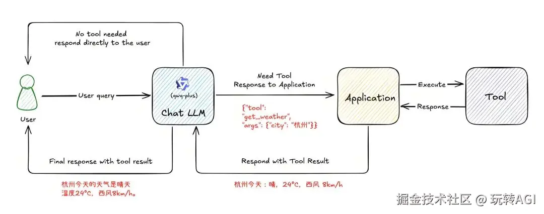 它判断你这个请求,需要调用一个叫获取天气的函数,然后自动生成参数“city=杭州”,调用完天气API -> 拿到结果 -> 生成回复:“明天杭州24℃,小雨,建议带伞”。