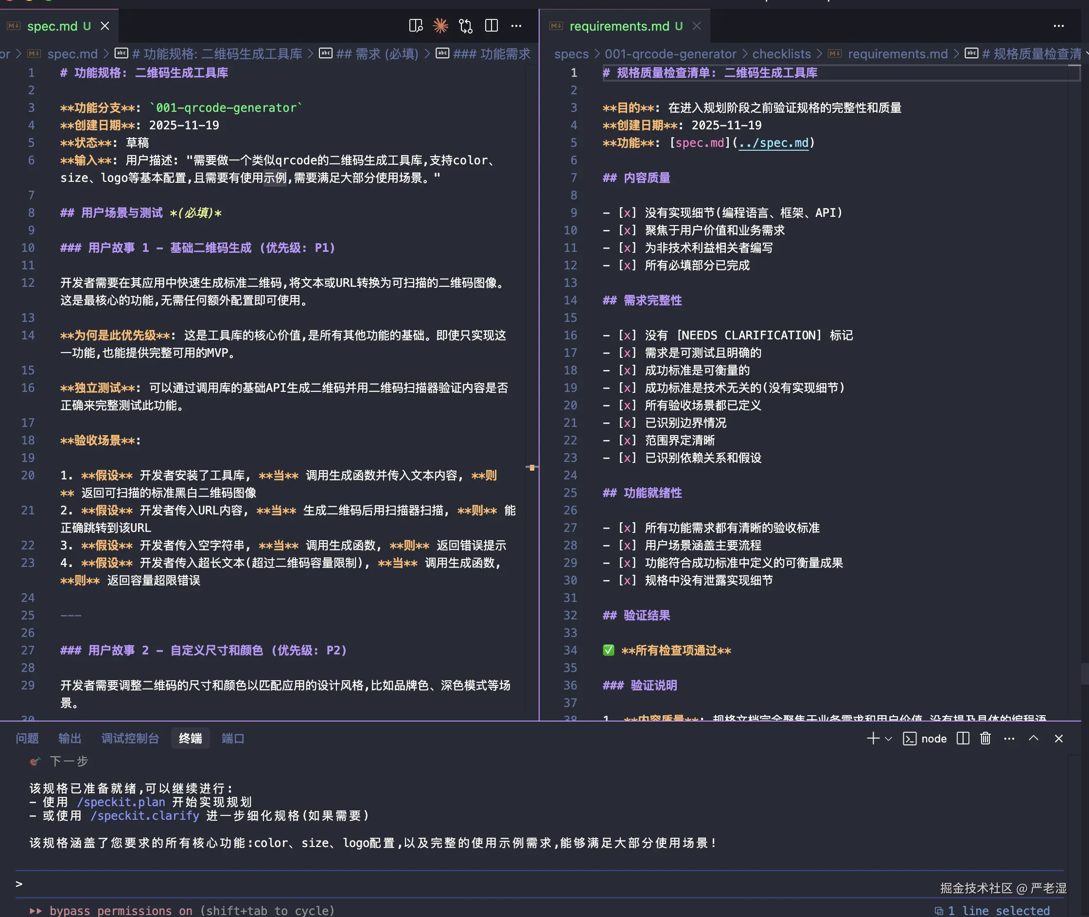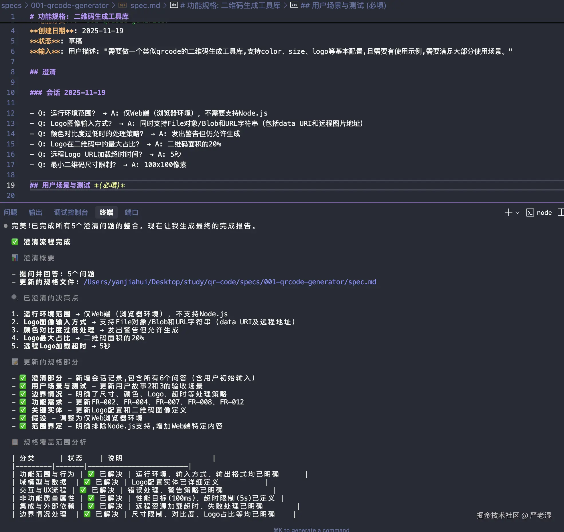 此步骤会生成 spec.md 和 requirements.md,明确功能需求和验收标准,为后续开发奠定基础。