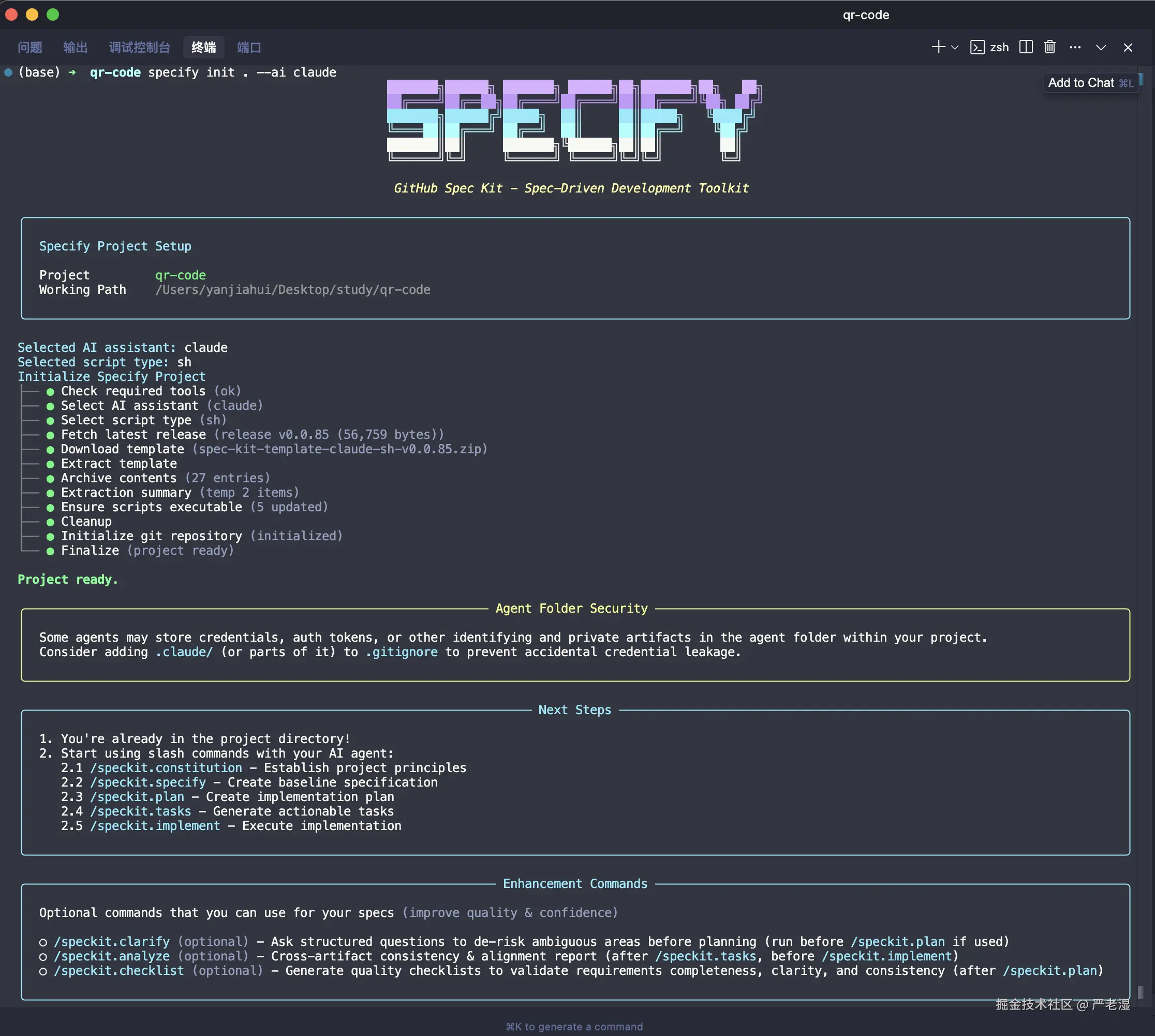在已有项目目录中执行初始化命令(claude 可替换为其他支持的 AI 助手):