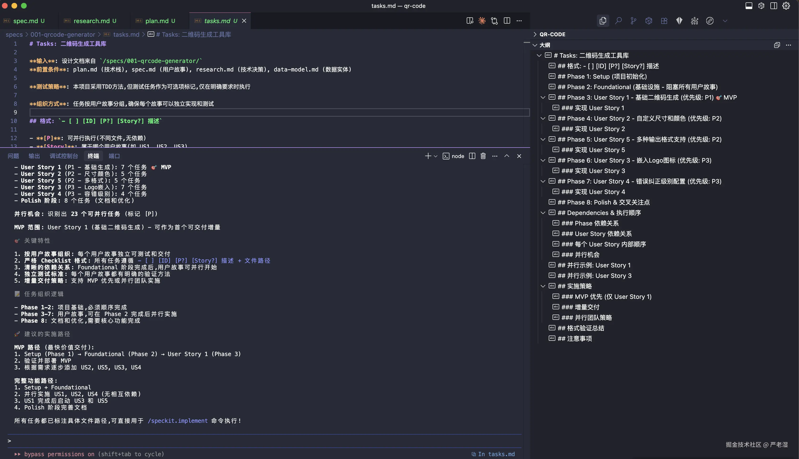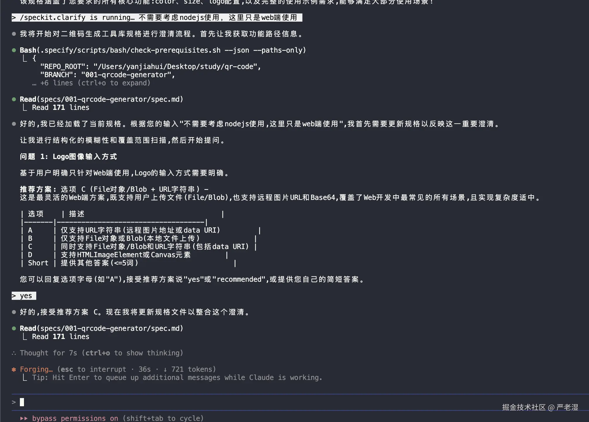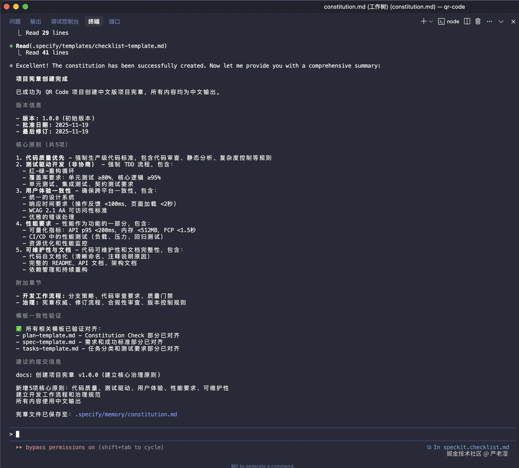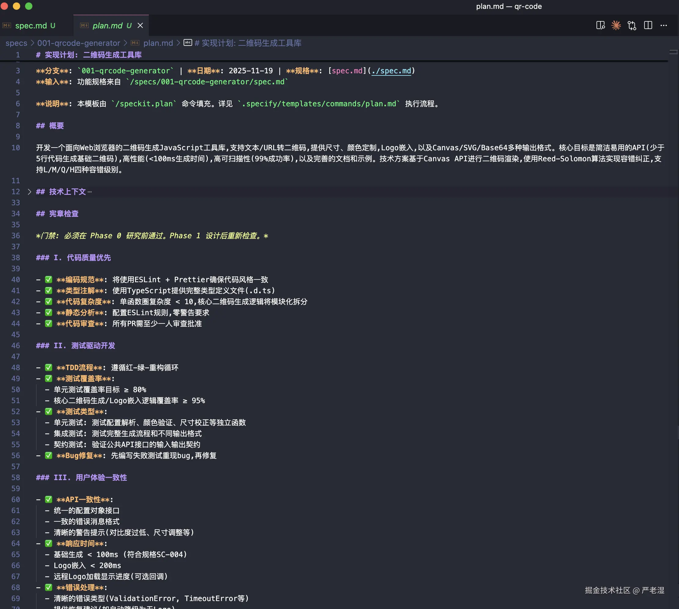 通过 Spec Kit 完成的二维码生成工具开发,从需求定义到代码实现,整体耗时约 1 小时(包含网络延迟和指令等待时间)。这种方法相比传统的即时 Prompt 工程,提供了更系统化的开发体验。
