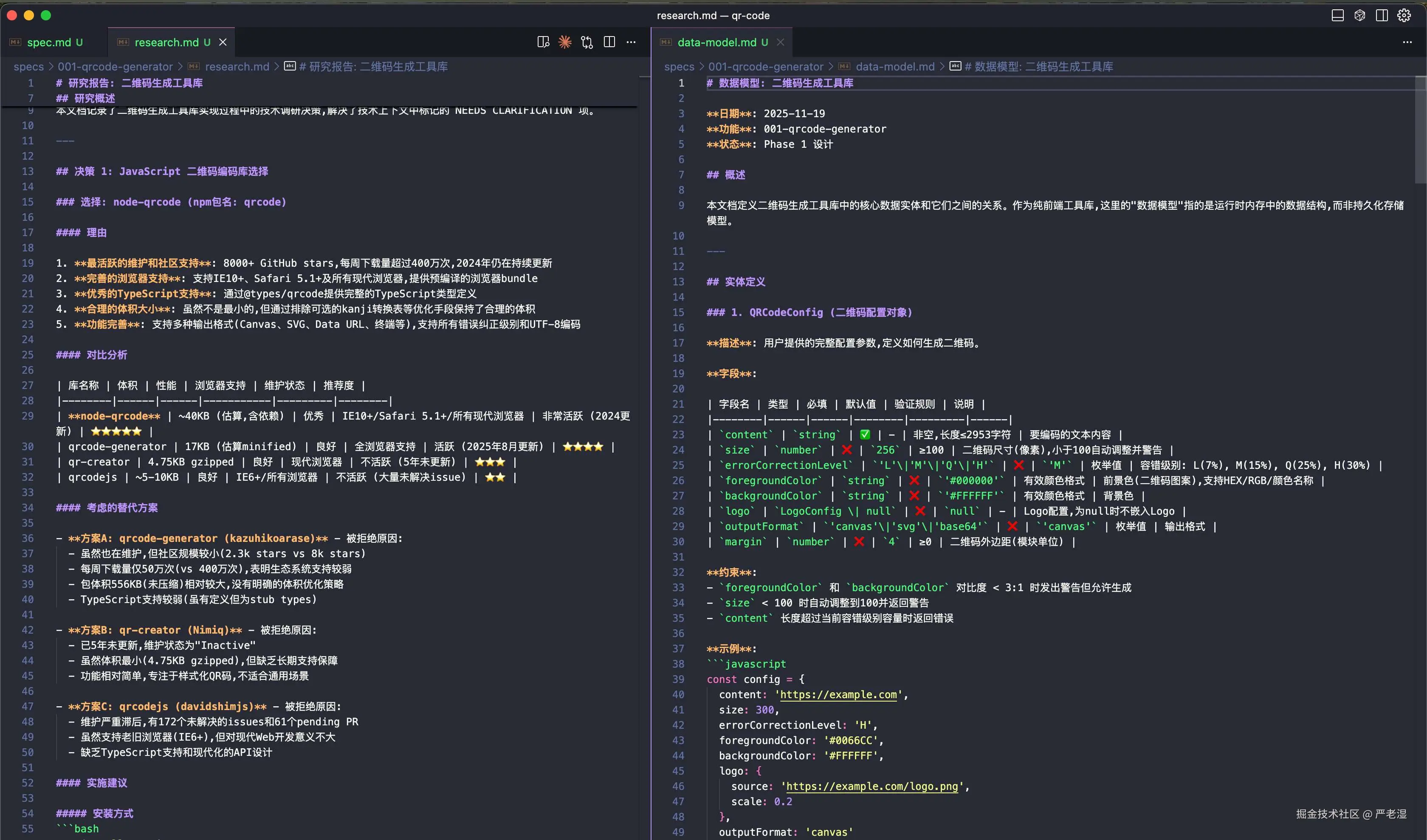 /speckit.specify 需要开发一个二维码生成工具库,支持 color、size、logo 等基本配置,提供使用示例,满足常见使用场景。