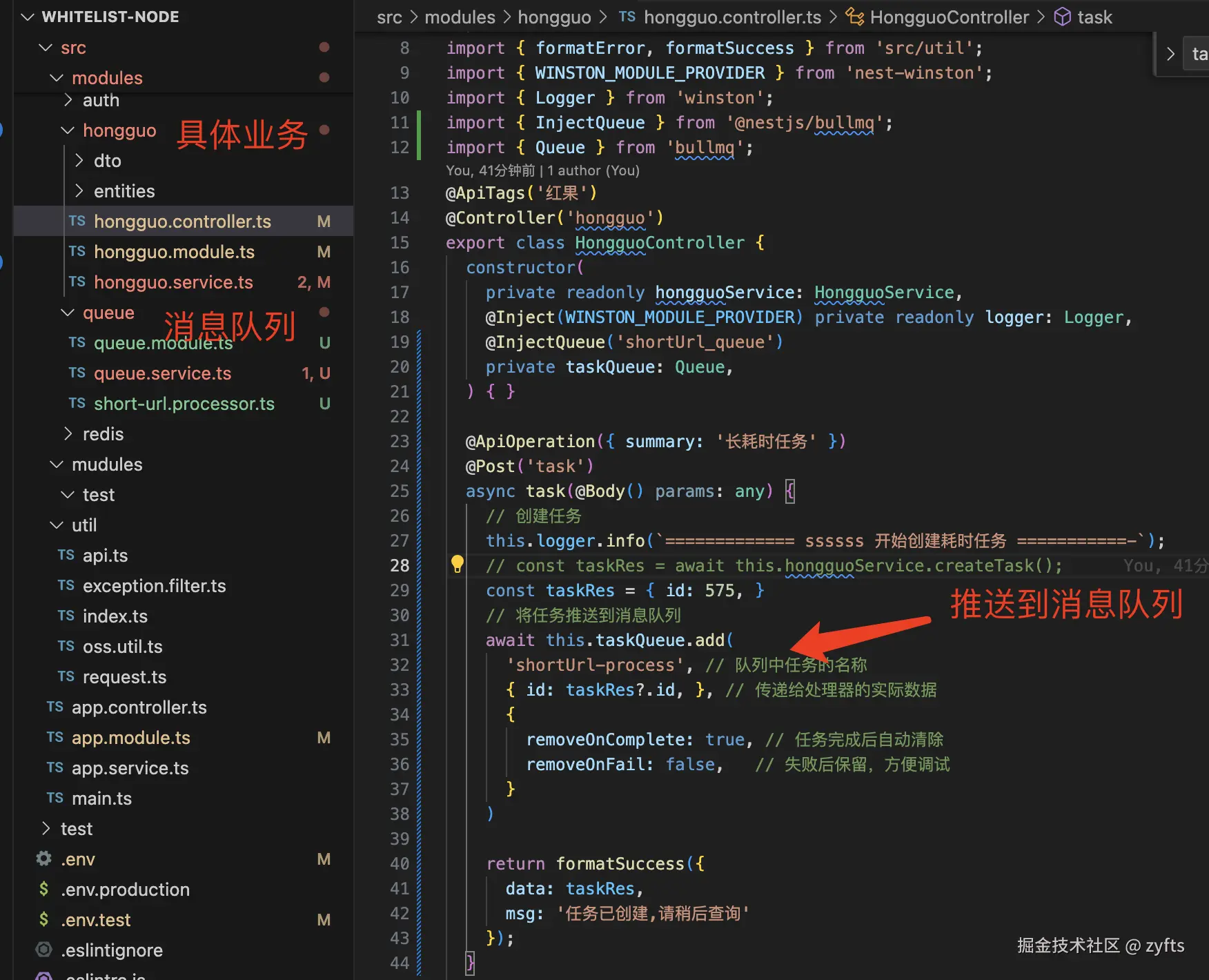现在,我们在业务 Controller 中使用 BullModule 提供的工具将任务推送到队列。