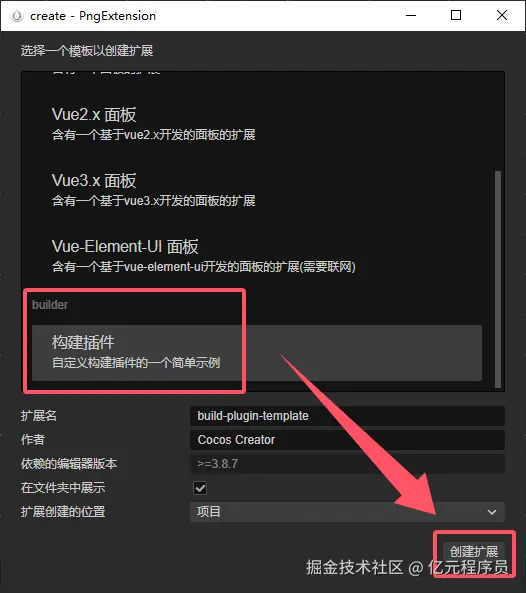 我们选择构建插件,这是官方自定义构建插件的一个简单示例,点击创建扩展,我们直接在上面扩展我们的自动压缩。