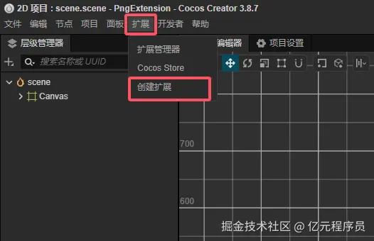 新建一个项目,通过菜单扩展->创建扩展打开扩展创建面板。