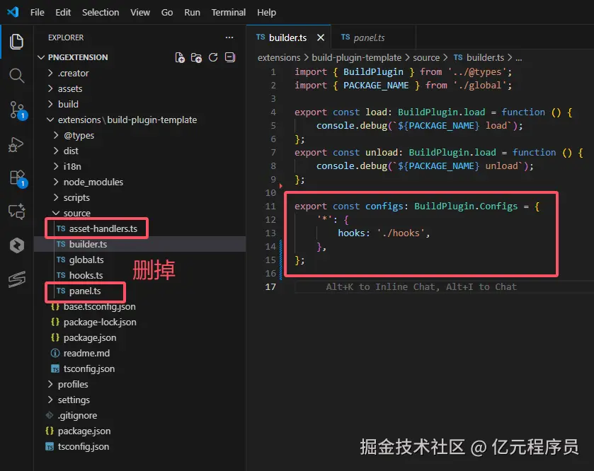 首先我们删掉我们不需要的asset-handlers.ts和panel.ts·,在builder.ts中只保留hooks配置。