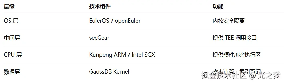 openGauss 的全密态能力与 secGear + Kunpeng + EulerOS 深度集成,形成“软硬一体化可信执行环境”: