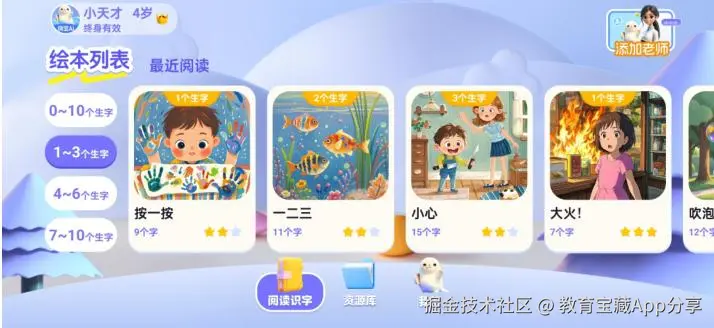 嗨宝AI有2000+ 绘本资源,且持续更新,涵盖“家庭、社交、自然、科普”等日常生活场景,让孩子在熟悉的情境中自然习得字词。内容分级科学,绘本按难度分层,覆盖从入门到高级,围绕一千字库高频复现。